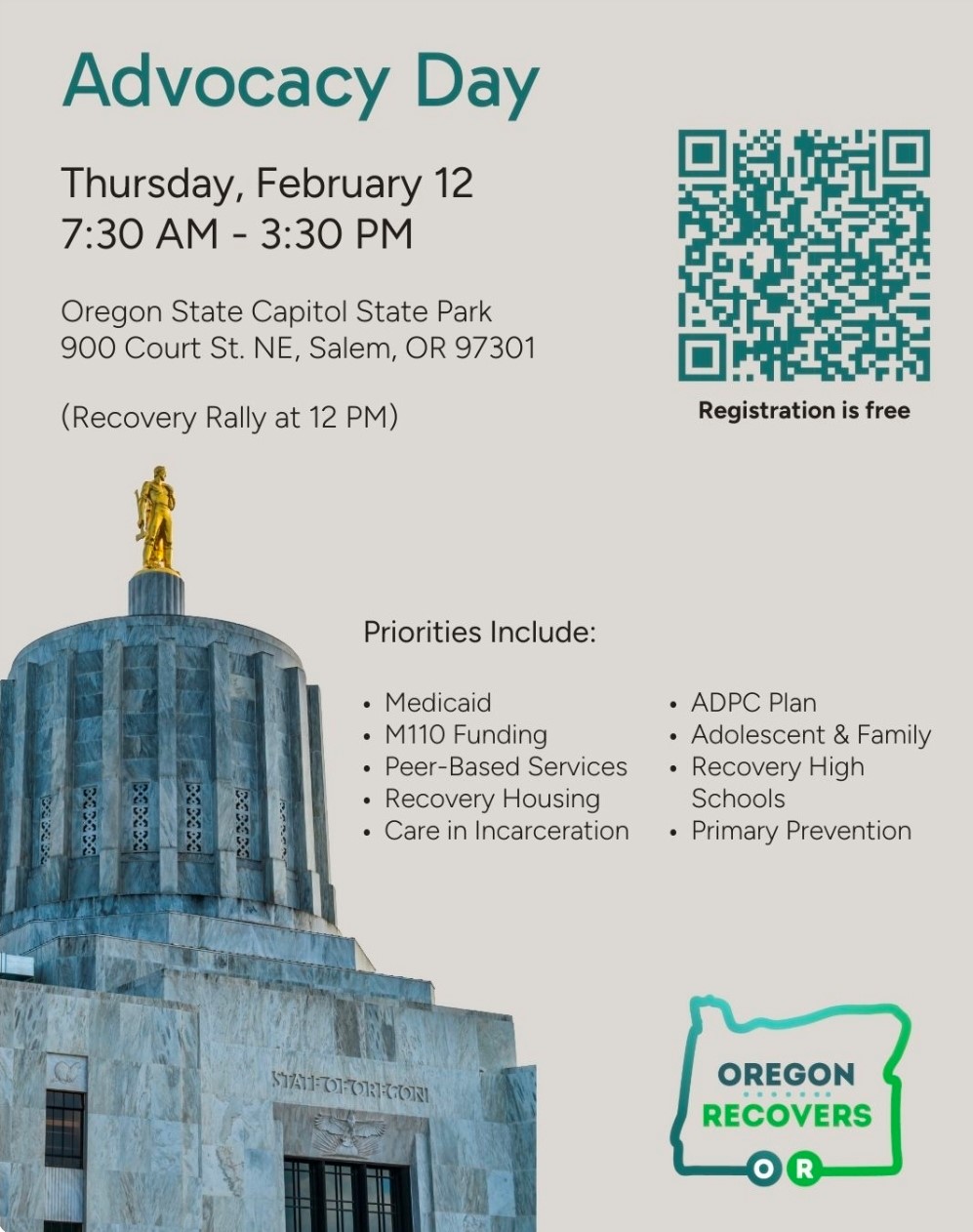 Advocacy Day will be held Thursday, Feb. 12, from 7:30 a.m. to 3:30 p.m. at the Oregon State Capitol in Salem.